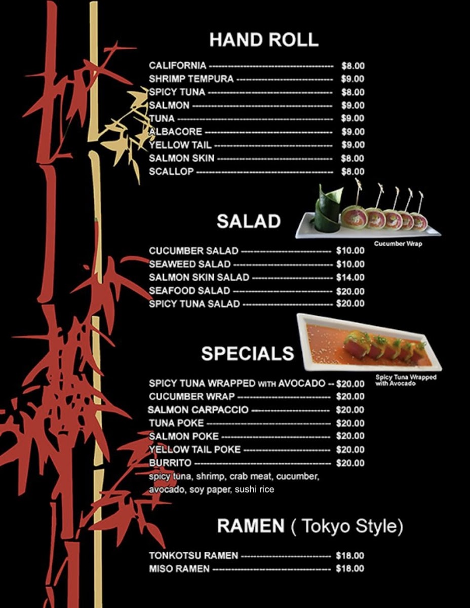 As for the main courses, you can't go wrong with the classic California Hand Roll priced at $6 or the flavorful Shrimp Tempura Hand Roll. For ramen lovers, the Tonkotsu Ramen and Miso Ramen, both at $13, offer hearty broths and perfectly cooked noodles that warm the soul.
